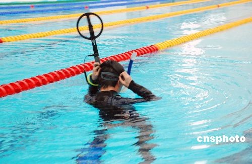 一名警察在對北京奧運場館“水立方”水底設施實施防爆安全檢查。