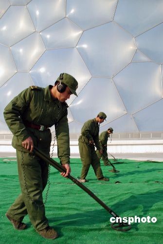解放軍工兵正對北京奧運場館“水立方”外圍實施防爆安全檢查。