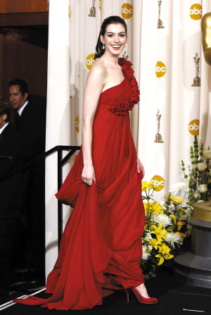 安妮·海瑟威 最典雅的紅色穿法。海瑟威一襲Marchesa禮裙讓人驚艷,從肩部到腰處斜斜地點(diǎn)綴著一道花束帶,加上裙擺上的皺褶,看上去如古希臘雕像般典雅美艷。