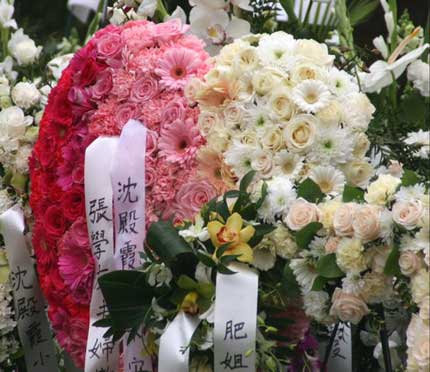 此時(shí),墓地上只有肥肥的好友陳淑芬和其兒子守候。肥肥的墓穴上面鋪上了新草皮,上面釘了一個(gè)小牌子,四周是白色為主的花圈,顯得莊嚴(yán)圣潔。送花圈還包括徐小鳳、張學(xué)友等藝人。記者 黃運(yùn)榮 金雷 攝影