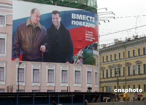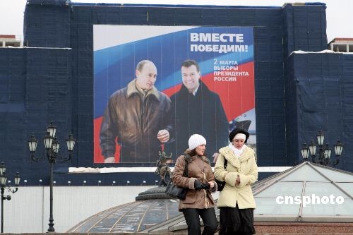 3月1日,在莫斯科紅場旁邊,現任俄羅斯總統普京與政府第一副總理、下屆總統的熱門侯選人梅德韋杰夫的巨幅海報,上書“我們攜手贏取勝利”十分醒目。梅德韋杰夫曾多次表示,他若當選后將繼續執行普京路線。3月2日,俄羅斯將舉行總統大選。中新社發 田冰 攝