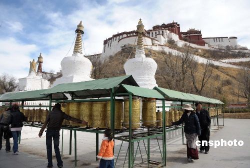 3月20日,拉薩民眾在布達拉宮下的宗角祿康公園內轉經。