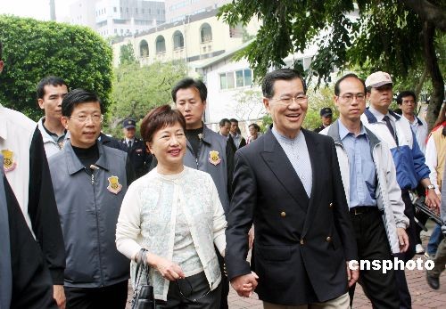 蕭萬長與夫人在臺北一個投票所投票后,在警力的保護下離開。