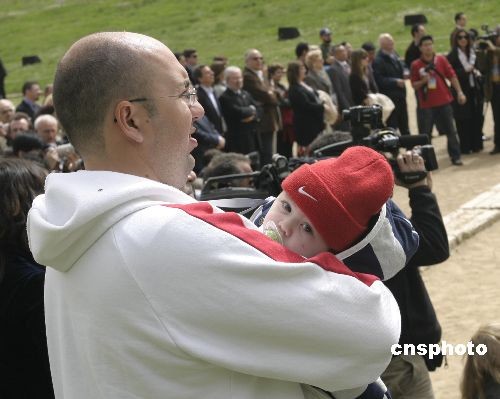 當?shù)貢r間3月23日,北京奧運圣火采集最后一次彩排在希臘古奧林匹亞遺址舉行,一位父親懷抱不到半歲的嬰兒觀看采集儀式。中新社發(fā) 王歡 攝