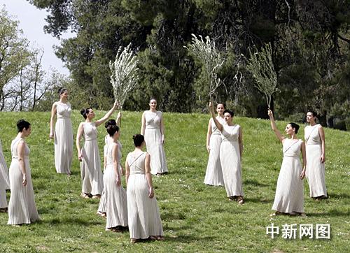 希臘當(dāng)?shù)貢r間3月24日,北京二00八年奧運會圣火采集儀式在古奧林匹亞競技場舉行,最高女祭司順利采集到火種。女祭司手擎橄欖枝不斷變幻隊形,在山坡上舞蹈。中新社記者 王歡