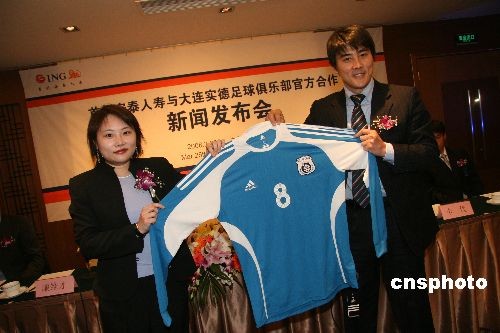3月25日,在中超2008賽季開賽的前4天,大連實(shí)德足球俱樂部舉行新聞發(fā)布會(huì)。總經(jīng)理李明及主教練拉德科出席并正式宣告首創(chuàng)安泰人壽成為其官方合作伙伴。發(fā)布會(huì)上還展示了大連實(shí)德的中超2008賽季新隊(duì)衣。中新社發(fā) 大新 攝