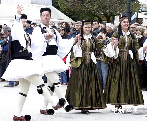 3月25日,北京2008年奧運圣火希臘傳遞第二天,慶典儀式在終點約阿尼納舉行。舞蹈演員們跳起民族舞蹈迎接北京奧運圣火。據悉,這種希臘非常著名的傳統(tǒng)舞蹈,只有在重大節(jié)日或儀式慶典的時候才會表演。中新社記者 王歡