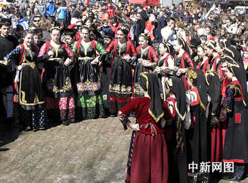 3月26日,北京奧運會圣火希臘境內傳遞第三日,抵達冰雪覆蓋的山城邁措翁。青少年跳起希臘傳統舞蹈歡迎奧運圣火。中新社記者 王歡