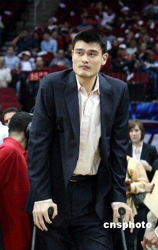 當地時間3月26日晚,姚明手術后首次公開露面,觀看火箭隊友與森林狼隊的比賽。火箭以97比86戰勝對手。中新社發 楊晉升 攝