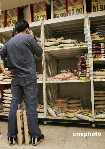 四月一日晚,香港市民在一家超市內購買大米。國際大米價格近日飆升,部分香港市民擔心大米漲價,連日到超市搶購。香港特區政府表示香港大米供應并無問題,呼吁市民毋須恐慌,但也會密切留意相關價格是否有異動。中新社發 武仲林 攝