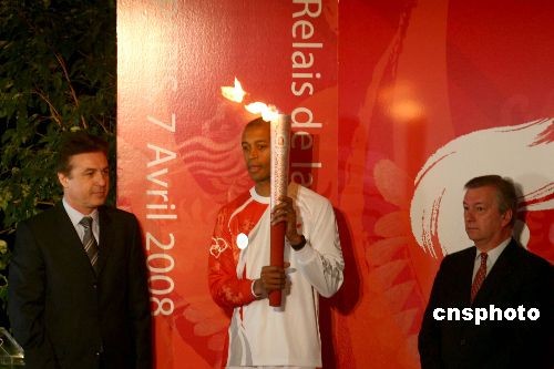 當地時間4月7日中午12時35分,北京奧運圣火在“浪漫之都”巴黎傳遞在巴黎的地標埃菲爾鐵塔拉開帷幕。圖為第一個火炬手、法國田徑運動員史蒂芬·迪亞加納(中)在現場展示祥云火炬。中新社發 沈晨 攝