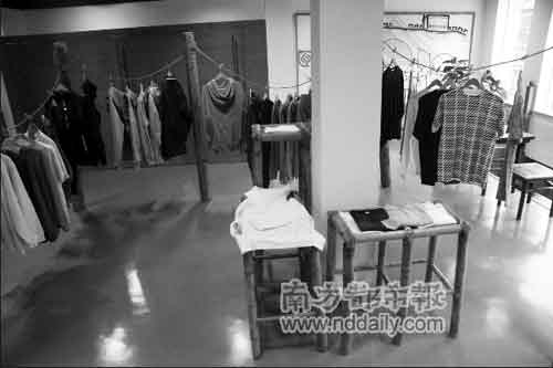 二樓,除了球鞋,還有一些外套和T恤,其中部分是陳冠希和他的朋友自己設計的,這些衣服掛在舊上海老式的竹竿上,簡約至極。
