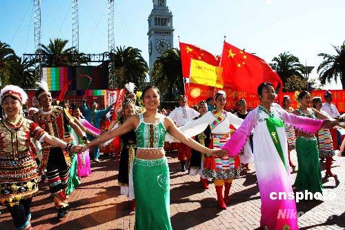 當地時間4月9日晨,美國南加州華人聯合總會等僑團400多位華人華僑連夜趕赴舊金山,迎接北京奧運圣火傳遞。 金立冬 攝