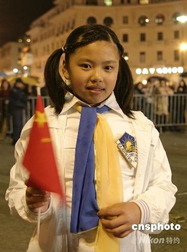 希臘當地時間3月27日,北京奧運圣火希臘境內第四天傳遞,在當天的終點塞薩洛尼基舉行慶典儀式。圖為童聲合唱團中唯一的華人女孩王佩珺。 王歡 攝