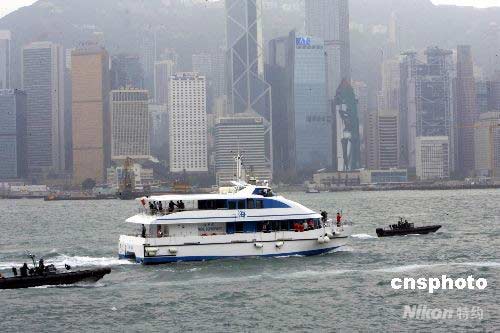 香港舉行北京奧運火炬傳遞路線預演,維港海上數艘警用巡邏艇、快艇、護送火炬傳遞游輪過海,消防船在維港射水致意、飛機空中盤旋護駕。 王麗南 攝