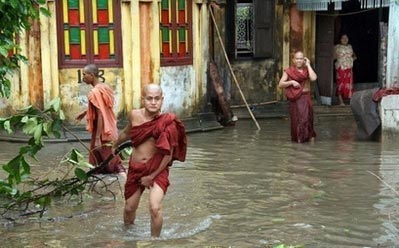 在緬甸的最大城市仰光,和尚們涉水行進。