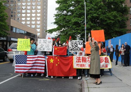 5月22日,位于美國紐約卡辛納大道和三福大道交界處的東南角,聚集著一群華人,而在他們對面,兩條大道交界處的西北角,則聚集著一群“法輪功”分子。一位白發老人高舉“只有共產黨才能救中國”的牌子,與“法輪功”的“天滅中共”的牌子形成鮮明的對照。