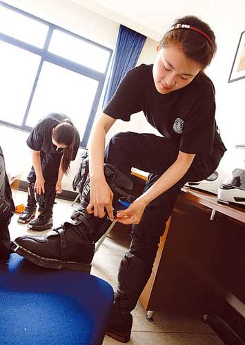 李亞麗穩穩當當地駕著摩托車圍著場地繞了一圈。那些從沒開過摩托車的姐妹們可就沒那么穩當了。25歲的“警花”甄珍,1米74的個頭,曾在警官樂團擔任打擊樂聲部長,隨團出訪日本參加世界警察音樂會。2002年從警校畢業后分配到車管所工作。性格開朗的她平時喜歡健身、看書、聽音樂。這次被調入帶路隊,心里甭提多高興了,“騎著摩托車、頭戴耳麥式頭盔、腳蹬馬靴、全身披掛著直接為奧運會服務,甭提多威武了。”可當她和女隊員們看到眼前這些自重都在500斤以上的大排量摩托車時,卻傻了眼兒。這哪是摩托車呀,簡直是條船。