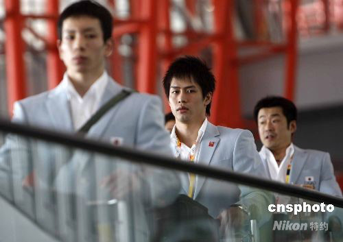 7月31日,日本體操男隊抵達北京首都國際機場。日本體操隊領軍人物福田洋之(中)隨隊抵達。中新社發 杜洋 攝