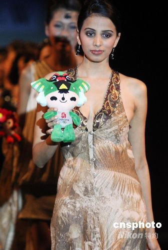 圖為模特手捧福娃展示劉薇最新時裝作品。