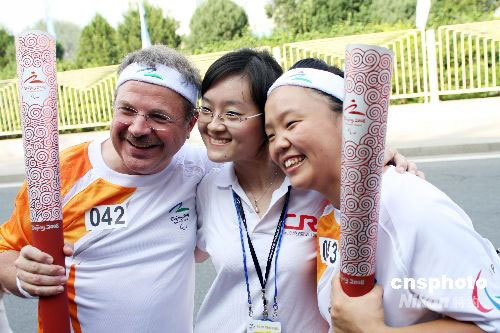 9月4日,殘奧會(huì)火炬到達(dá)北京,將在北京的“一壇兩園”展開最后一天傳遞行程。據(jù)北京市體育局副局長(zhǎng)孫學(xué)才介紹,北京地區(qū)的240名火炬手既有工作在基層一線的普通勞動(dòng)者,又有體壇名將、文藝工作者。其中,殘疾人士共70名,占火炬手總數(shù)的近30%。中新社發(fā) 王昊 攝