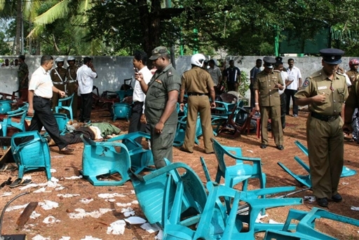 10月6日,在斯里蘭卡北部阿努拉德普勒鎮,安全人員查看爆炸現場。當天上午,一名自殺式襲擊者在阿努拉德普勒鎮老汽車站附近引爆了身上的炸彈。包括斯前陸軍參謀長佩雷拉及其夫人在內的至少27人在爆炸中死亡。