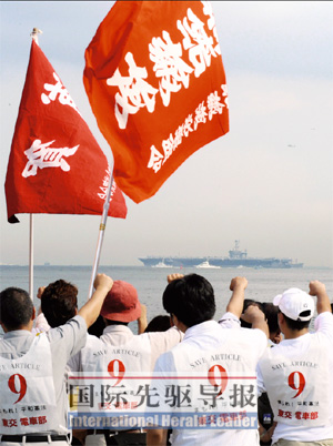國(guó)際先驅(qū)導(dǎo)報(bào)記者劉贊 特約撰稿秦帆發(fā)自東京 結(jié)束采訪走出美軍基地時(shí),基地大門前多了一隊(duì)全副武裝的防暴警察,一副嚴(yán)陣以待的架勢(shì)。兩名站崗的警察告訴《國(guó)際先驅(qū)導(dǎo)報(bào)》記者,平時(shí)基地門口就只有他們值班,但當(dāng)天為防止市民們抗議示威而增加了警力。此時(shí)在能看到航母經(jīng)過的岸邊,已聚集了數(shù)百名反對(duì)“華盛頓”號(hào)進(jìn)駐的居民揮舞拳頭高喊:“‘華盛頓’號(hào)滾回家去!”