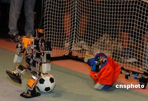 圖為參展的機器人在進行射門和防守對抗。中新社發 朱沿華 攝