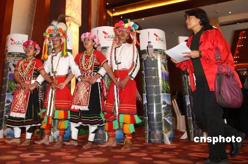 圖為來自臺(tái)灣的原住民在會(huì)場外載歌載舞歡迎賓客。
