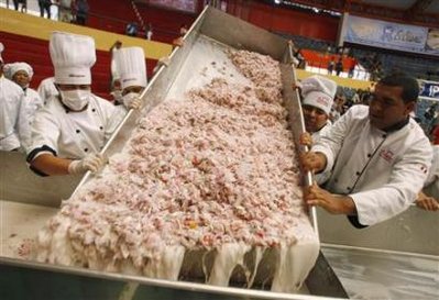 這種沙拉,簡單的形容就是檸檬魚,它用檸檬汁把魚肉腌熟。四百多名廚師和學生充當的義工在利馬的一座體育場制作這盤料理,吉尼斯紀錄派工作人員到場見證,體育場外有幾百名當地居民等著分享。
