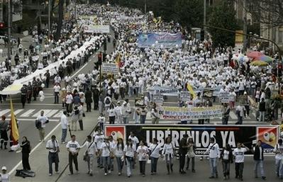 在哥倫比亞國慶節,100多萬人在各地舉行游行,要求左派叛軍釋放手中人質。
