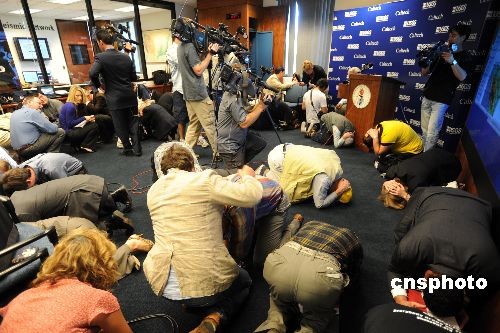 11月13日上午,美國洛杉磯地區模擬發生7點8級大地震,一陣模擬地震的音效響過,正在加州理工學院參加記者會的地震專家和媒體記者立即抱頭跪地,演練大地震來襲時的自救方式。中新社發 張煒 攝