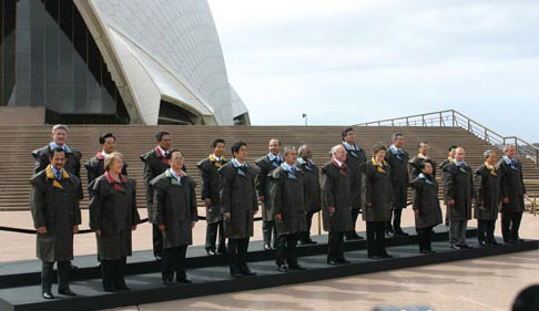 2007年悉尼APEC峰會的各領袖會穿什么“民族服裝”,主辦方一直保持高度神秘。直到各領袖在世界媒體前亮相之時才揭曉:原來澳洲選擇了深褐色的皮夾克,樣子很容易使人聯想到厚重的雨衣。