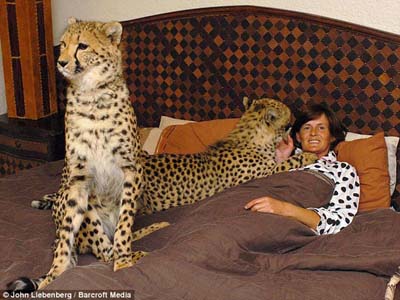 中新網7月3日電 據英國媒體報道,南非一名46歲女子在家中養了4只印度豹、5只獅子和2只老虎,她與它們同吃同住親密無間,甚至晚上睡覺時也同這些伙伴躺在一張床上。