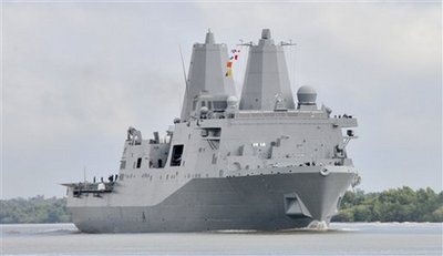 這艘軍艦是美國圣安東尼奧級船塢登陸艦的第六艘,全長二百零八米,船員二百九十名。來自世貿(mào)中心的鋼材于被用于制造“紐約號”上的兩棲登陸平臺,“它可以讓一支七百人的海軍陸戰(zhàn)隊(duì)在任何地方登陸”,美國海軍少校柯蒂斯·瓊斯說。目前“紐約號”的主要任務(wù),正是將美國海軍部署到反恐行動(dòng)現(xiàn)場。