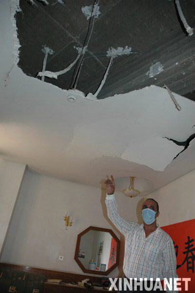 就在拿到相機轉身的一瞬間,第二聲巨響響起,整個大樓劇烈顫抖起來,陽臺的玻璃門爆裂,無數的碎玻璃打在記者剛離開的辦公桌前。陽臺上的衛星電話、辦公桌上的英文字典和地上的垃圾桶被氣浪掀飛起來,記者也被氣浪掀倒在沙發后。鋁合金門框整個砸到墻上。記者的頭頂碎石亂飛,天花板出現了3個大窟窿,落下的天花板砸在記者床上。樓道里傳來其他房間的天花板和門窗倒塌之聲,嗆人的煙霧充滿整個樓道。