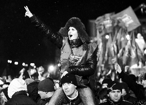 5日,烏克蘭首都基輔,一名亞努科維奇的支持者作勝利手勢。烏克蘭將于7日進行總統大選第二輪投票。