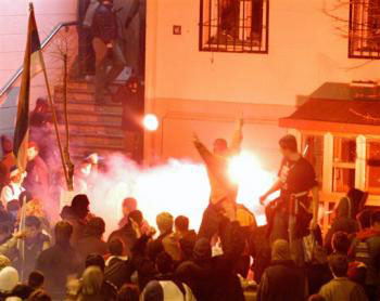 事件發(fā)生時(shí),至少有15萬(wàn)塞族示威者在貝爾格萊德市中心舉行集會(huì),塞爾維亞總理科什圖尼察對(duì)示威者發(fā)表了譴責(zé)科索沃獨(dú)立的激情演講。大部分塞族人把科索沃視作塞爾維亞的宗教和文化發(fā)源地。