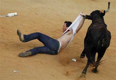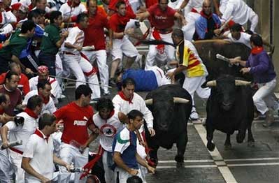 為期9天的奔牛節,于6日早晨開始,人們把公牛趕到一起,在街上狂奔;人們傾巢而出,充塞街頭,最后跑向斗牛場,與牛共舞。