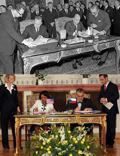 當賴斯和施瓦岑貝格笑容可掬地站在那張金碧輝煌的雕花簽字桌旁沖著記者們的閃光燈舉起手里一紅一黑的協定時,他們還不知道在同一張簽名桌上40年前誕生過一個令捷克蒙受奇恥大辱的城下之盟。
