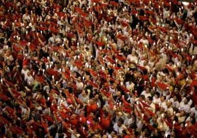 中新網7月15日電 綜合報道,7月15日凌晨,為期9天的盛大的奔牛節在西班牙北部城市潘普洛納落下帷幕。成千上萬的狂歡者聚集到市政廳前,手舉蠟燭和紅絲巾參加閉幕活動。