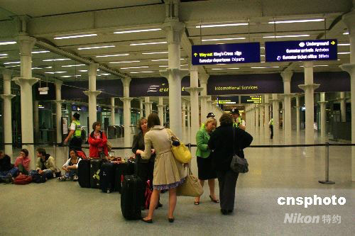 圖為11日晚間,倫敦圣潘克斯火車站取消了前往巴黎和布魯塞爾的列車,現場滯留的乘客被迫排隊等候訂酒店。