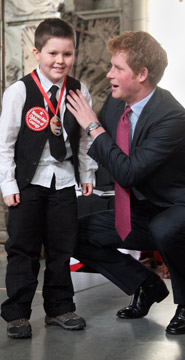 在頒獎典禮上,24歲的哈里蹲下身擁抱每一個獲獎兒童,給予他們充滿溫暖的問候和笑容。為了緩解孩子們的緊張,哈里一直用手輕拍他們的后背。他小心翼翼給一個小女孩戴上獎牌唯恐碰到女孩頭發,讓人實在無法想象他曾是一個醉醺醺出盡洋相的“混世魔王”。這位“愛心王子”的用心,讓每一個緊張的孩子露出可愛的笑臉。