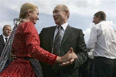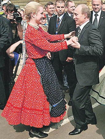 資料圖片:2007年7月,普京來到俄羅斯莫爾多瓦自治共和國首府薩蘭斯克市,參加首屆國際芬蘭-烏戈爾語系民族藝術節開幕式。活動期間,普京受到久爾恰尼的鼓舞,和匈牙利美女翩翩起舞。