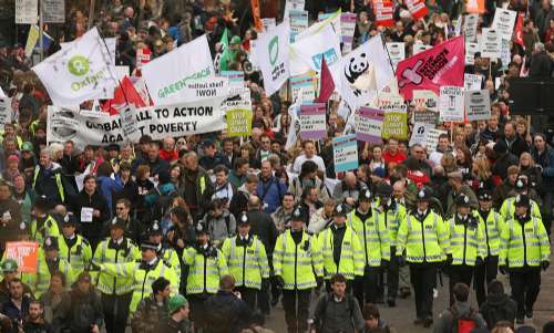 示威者行經國會大樓,吹響哨子,大喊“我們憎恨銀行”,標語五花八門,有“人民為先、利潤居后”、“離開伊拉克和阿富汗”等,部分語句則較為激進,如“問吊銀行家”、“沖擊銀行”。當他們行至唐寧街的首相府時,紛紛報以噓聲。