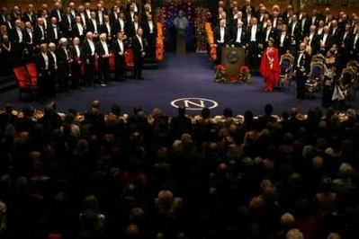 中新網(wǎng)12月12日電 綜合報(bào)道,2007年諾貝爾獎(jiǎng)?lì)C獎(jiǎng)典禮近日分別在挪威首都奧斯陸和瑞典首都斯德哥爾摩隆重舉行。不同領(lǐng)域的多位獲獎(jiǎng)?wù)吆粲跬黄茖W(xué)科和國(guó)家界限,應(yīng)對(duì)全球變暖等人類共同面對(duì)的挑戰(zhàn)。瑞典國(guó)王,王后等王室成員還與諾貝爾獎(jiǎng)獲得者共享大餐。