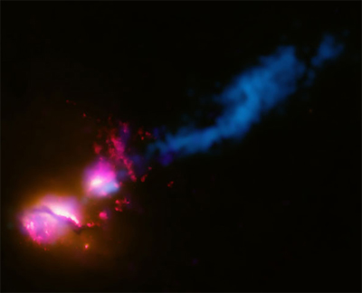 這個(gè)噴射能量的稍大一點(diǎn)的星系被天文學(xué)家稱為死亡星系,其中心部分的黑洞附近噴射出一股高能量粒子與磁場,噴射區(qū)寬有一千個(gè)光年,其威力之大,任何星球上的類似生命的東西都無法抵御。較小的星系被速度達(dá)光速的粒子擊中的地方顯示出亮光。