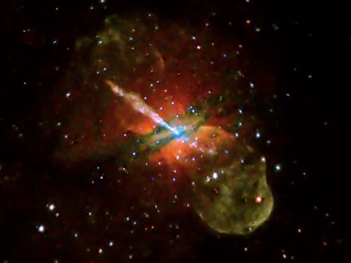 圖片中的左上角是一條延伸距離達(dá)1.3萬(wàn)光年的X射線(xiàn)噴射物,以及一條向反方向延伸的較短的“反向噴射”。天文學(xué)家認(rèn)為,這種動(dòng)力射流起到了重要的運(yùn)輸作用,把來(lái)自黑洞的能量傳遞到規(guī)模更大的星系,同時(shí)還影響那里恒星的速度。