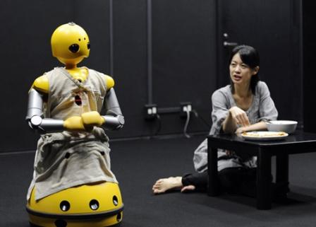 演員與機器人“Wakamaru”合演話劇的場面。
