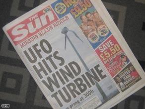 據CNN報道,本月8日 一個不明飛行物襲擊了英國林肯郡的一個小村莊,一個風能發電機的扇葉被飛行物擊出了20米遠。